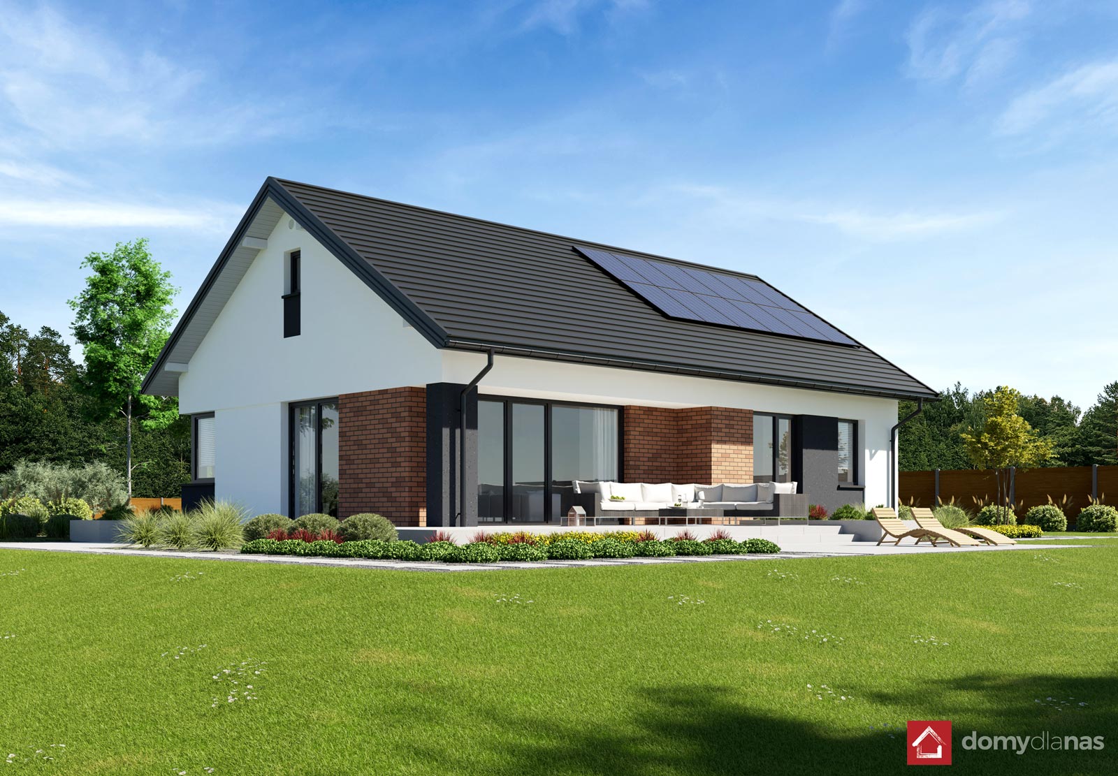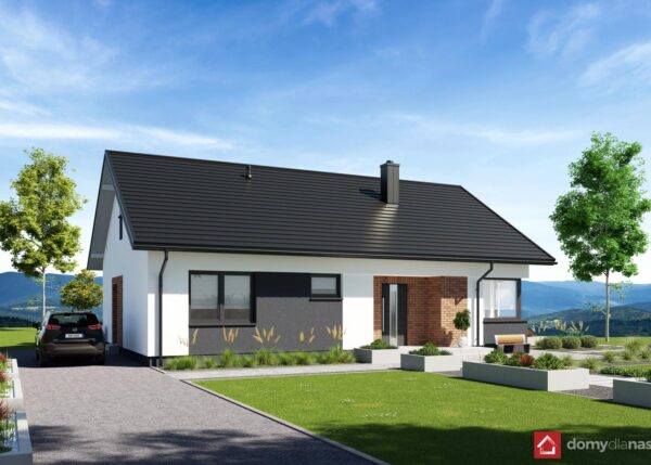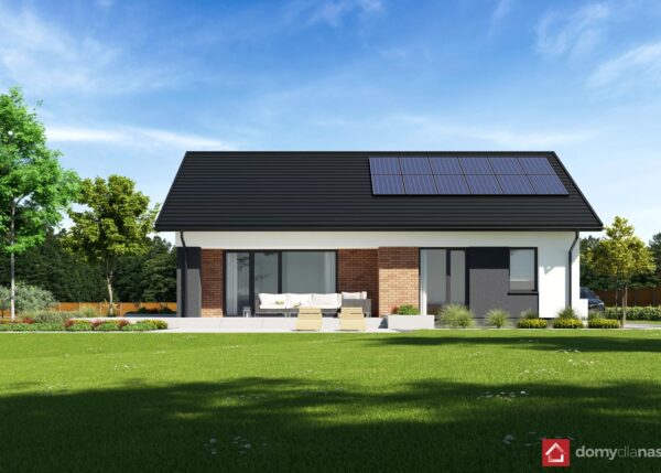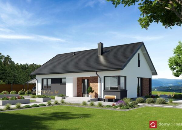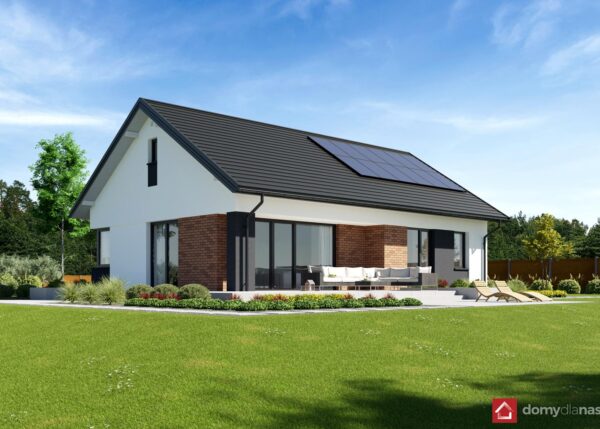 wykończenie zewn.: tynk silikonowy, okładzina z elastycznych płytek elewacyjnych, blachodachówka panelowa
