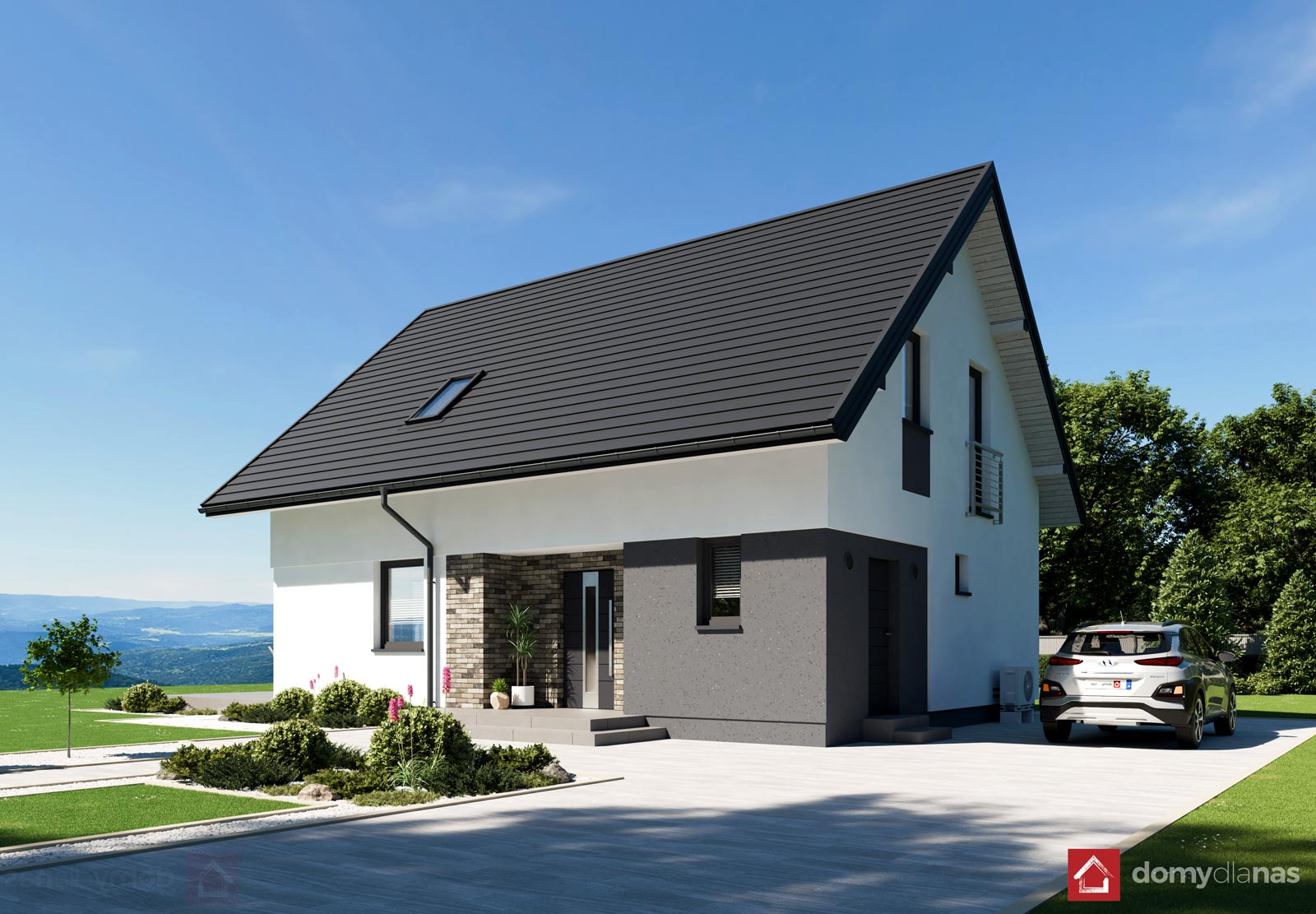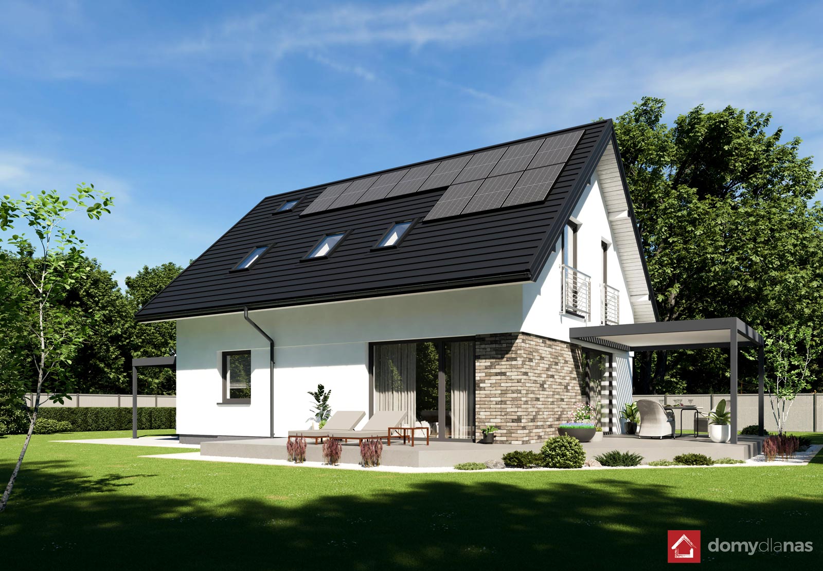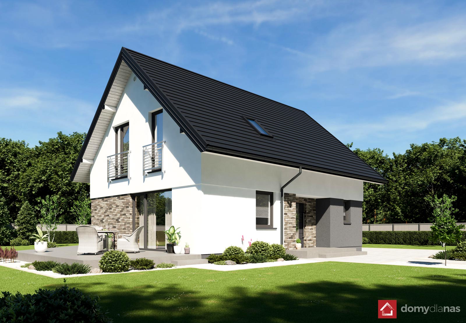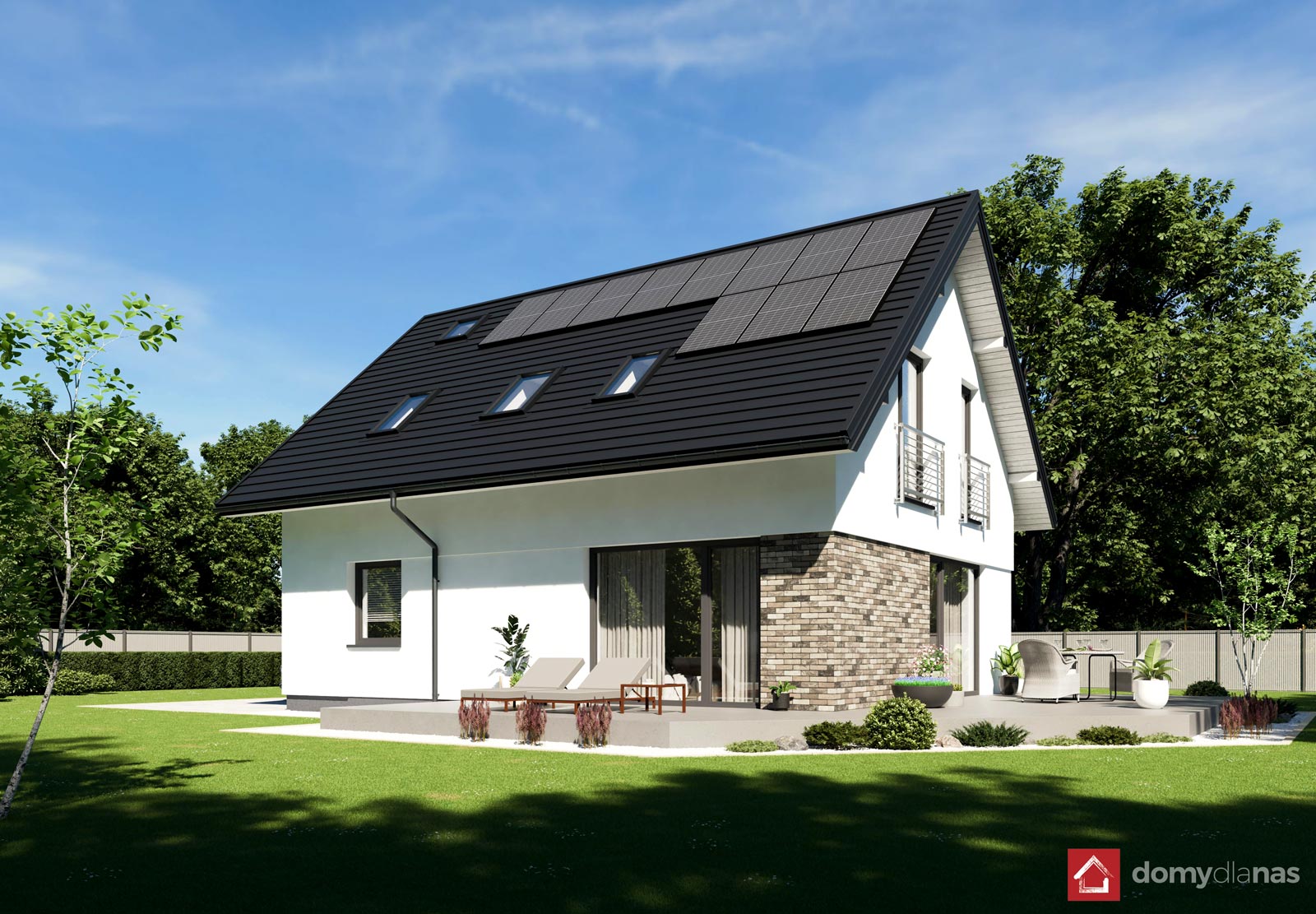 wykończenie zewn.: tynk silikonowy, elastyczna cegła elewacyjna, blachodachówka panelowa
