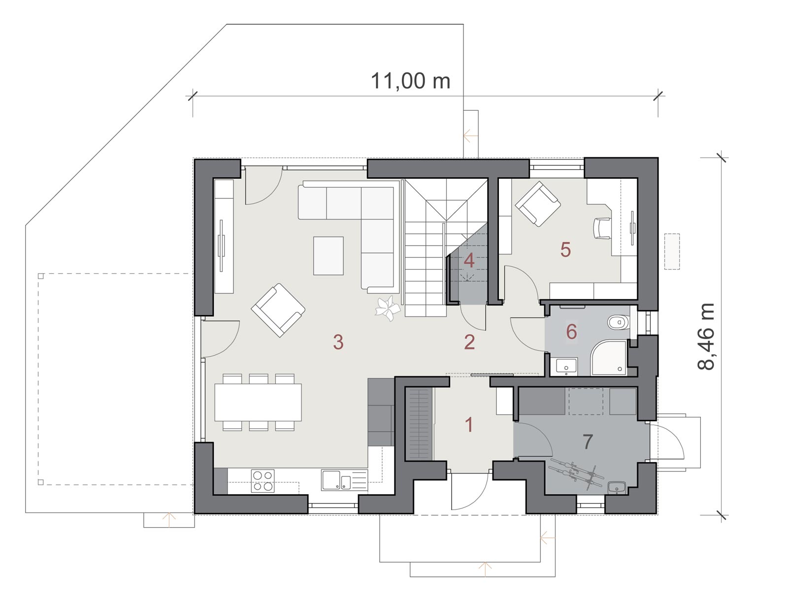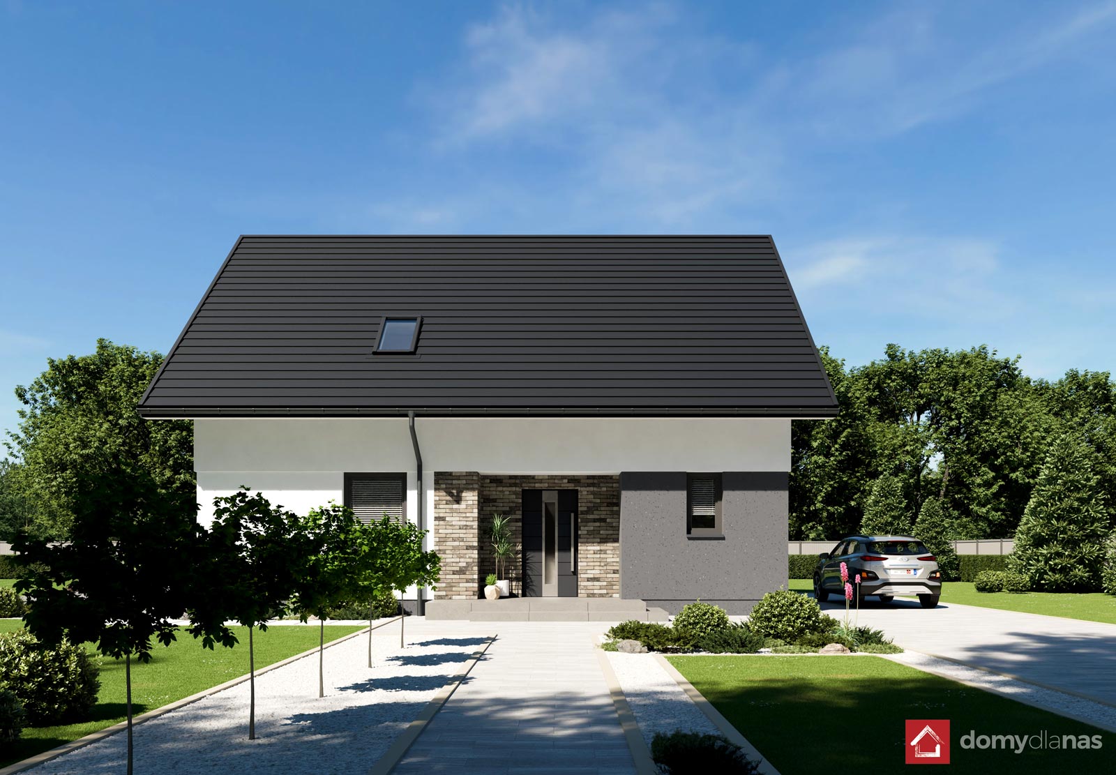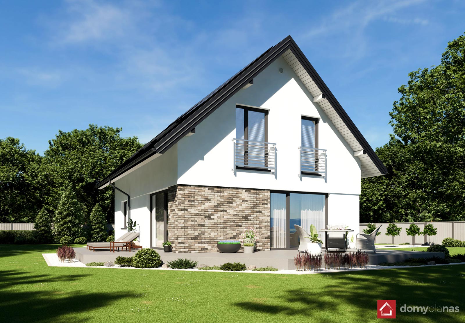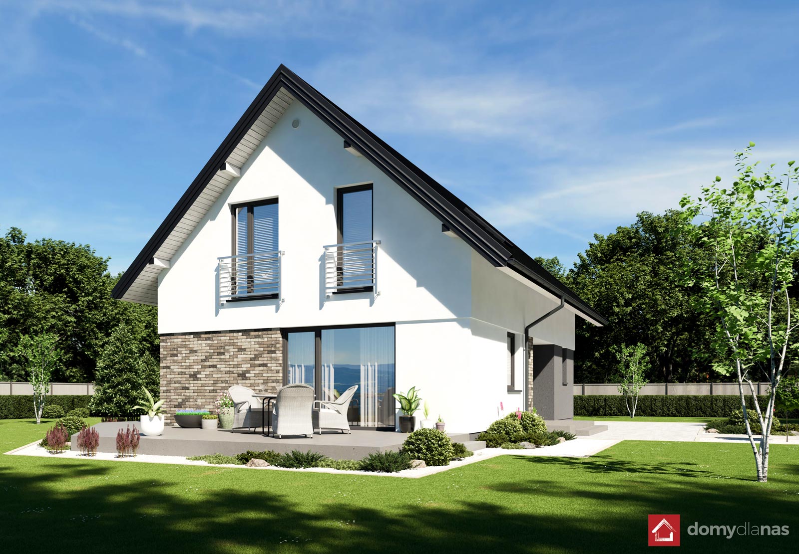 wykończenie zewn.: tynk silikonowy, elastyczna cegła elewacyjna, blachodachówka panelowa