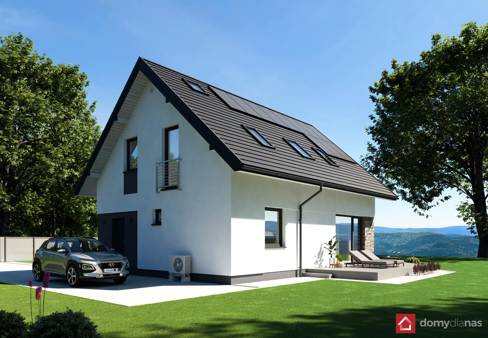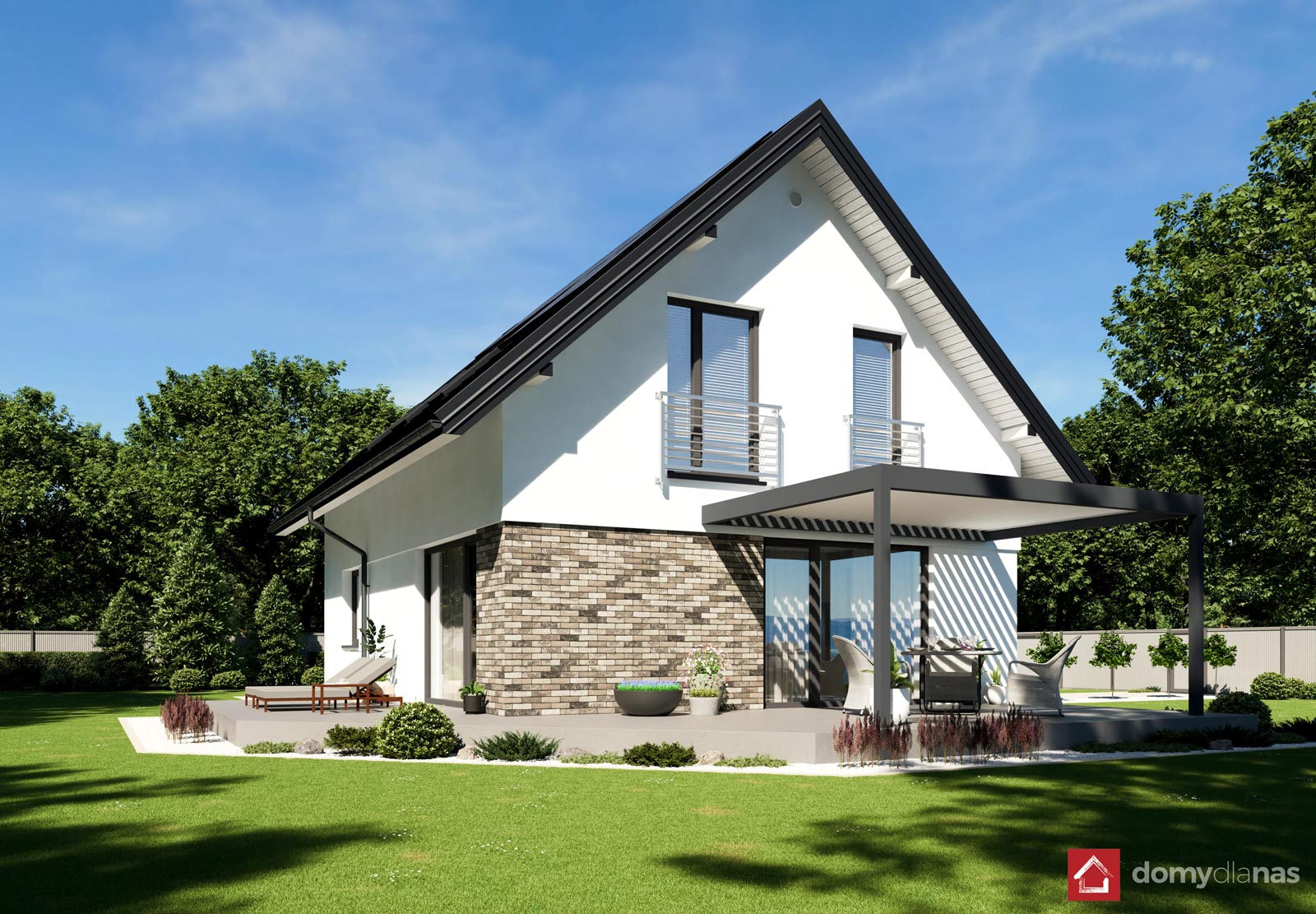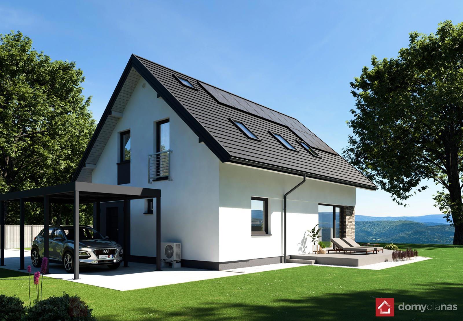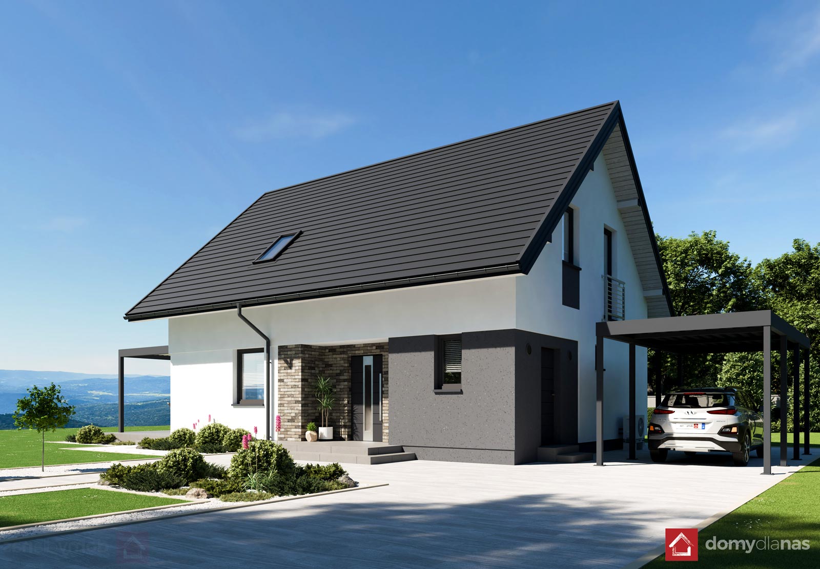 Przedstawione na wizualizacjach pergola i wiata postojowa mają charakter poglądowy.