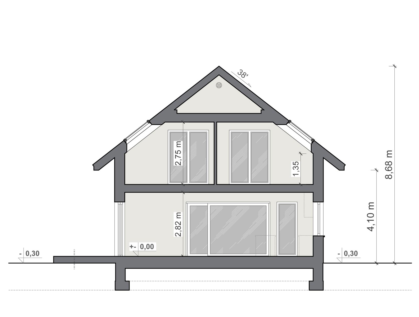 kąt nachylenia dachu skośnego: 38 o